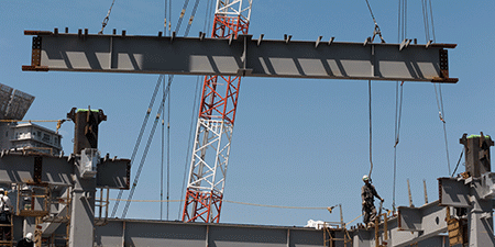 高層ビルなどで、タワークレーンを使い、人間でいうと骨組みになる鉄骨を吊り上げ、組み立てていきます。当然安全に十分配慮した形ですが、高所での作業を行います。「鉄骨建方」と呼びます。安全のためのネットや安全帯の設備の設置も同時に行っていきます。